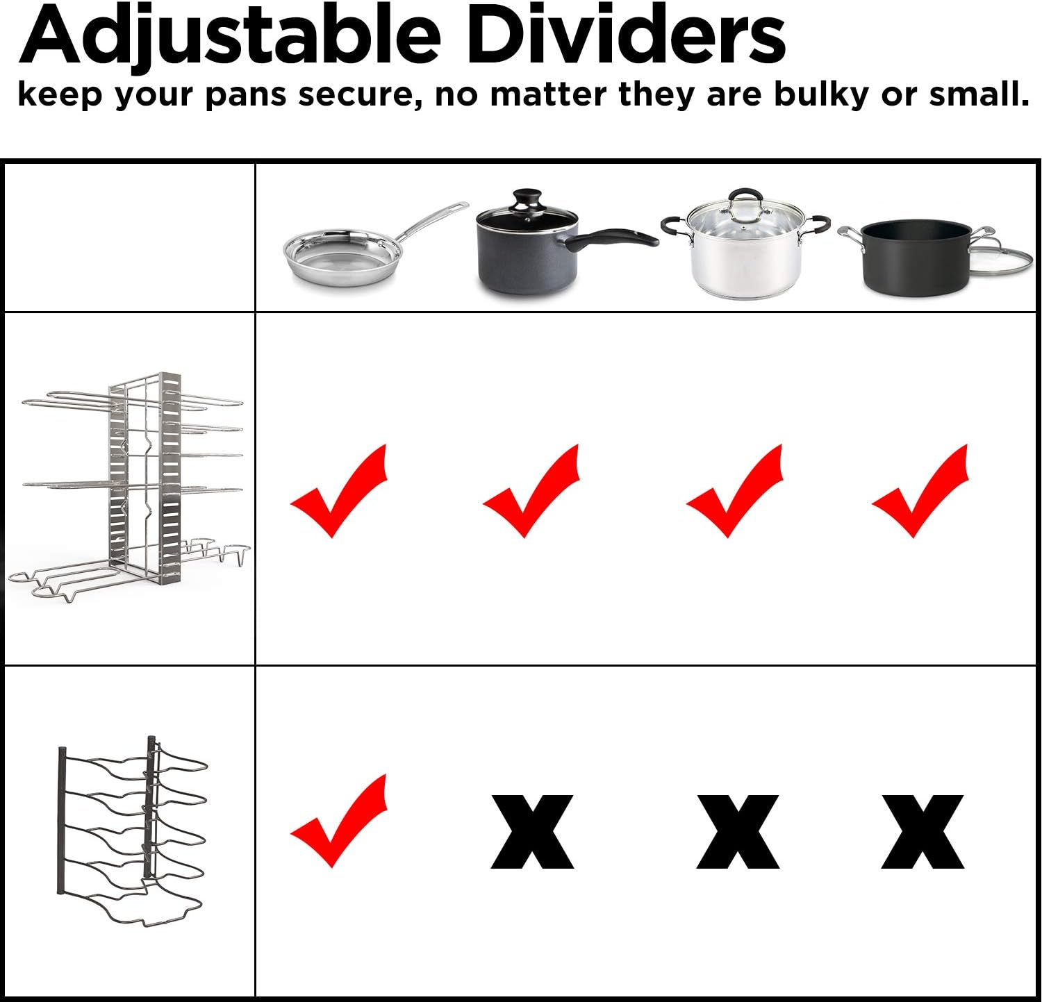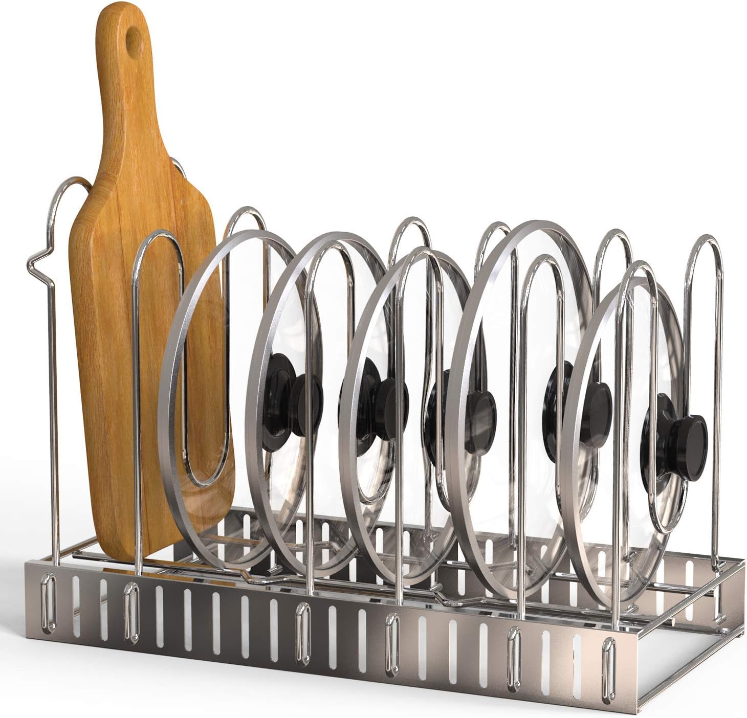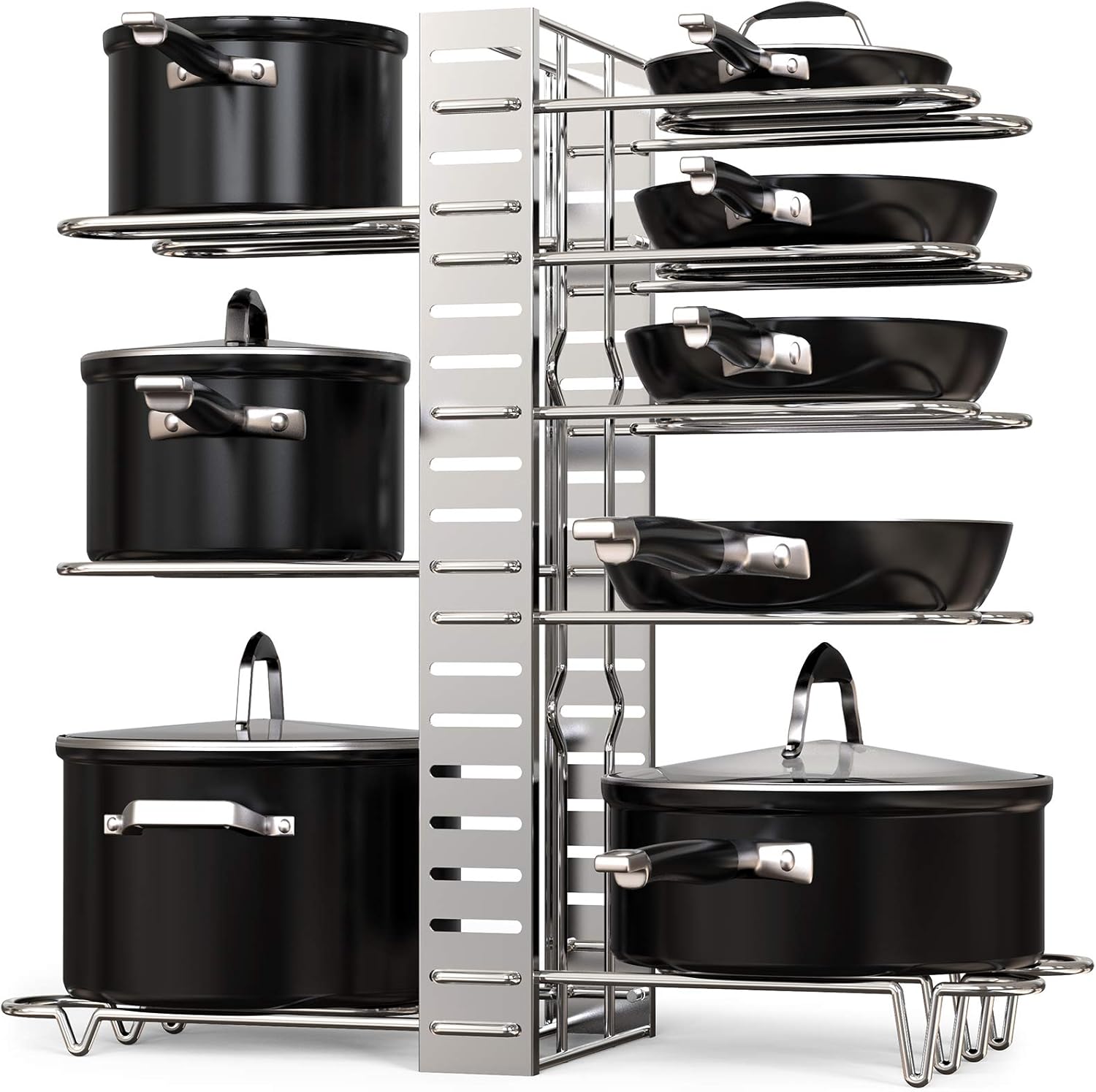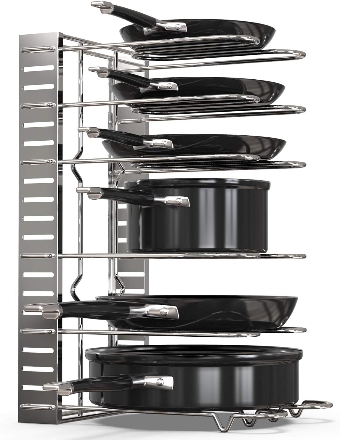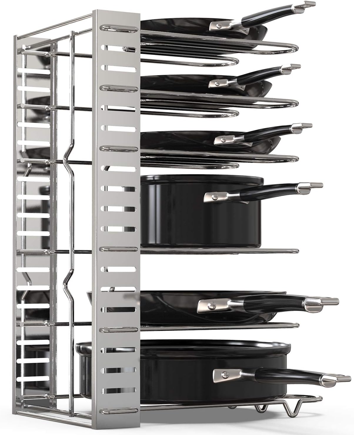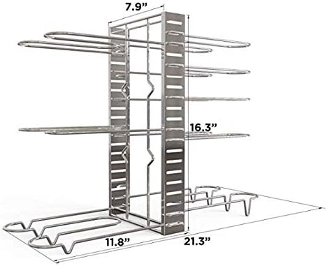 - [ Easy to Install ] No tools are necessary and comprehensive instructions are included, allowing you can be set up in under 1 minute. The pot lid rack coming with 8 adjustable tiers, you can either install 8 tiers on one side of the pan rack or install 4 tiers on both sides of the pan rack.