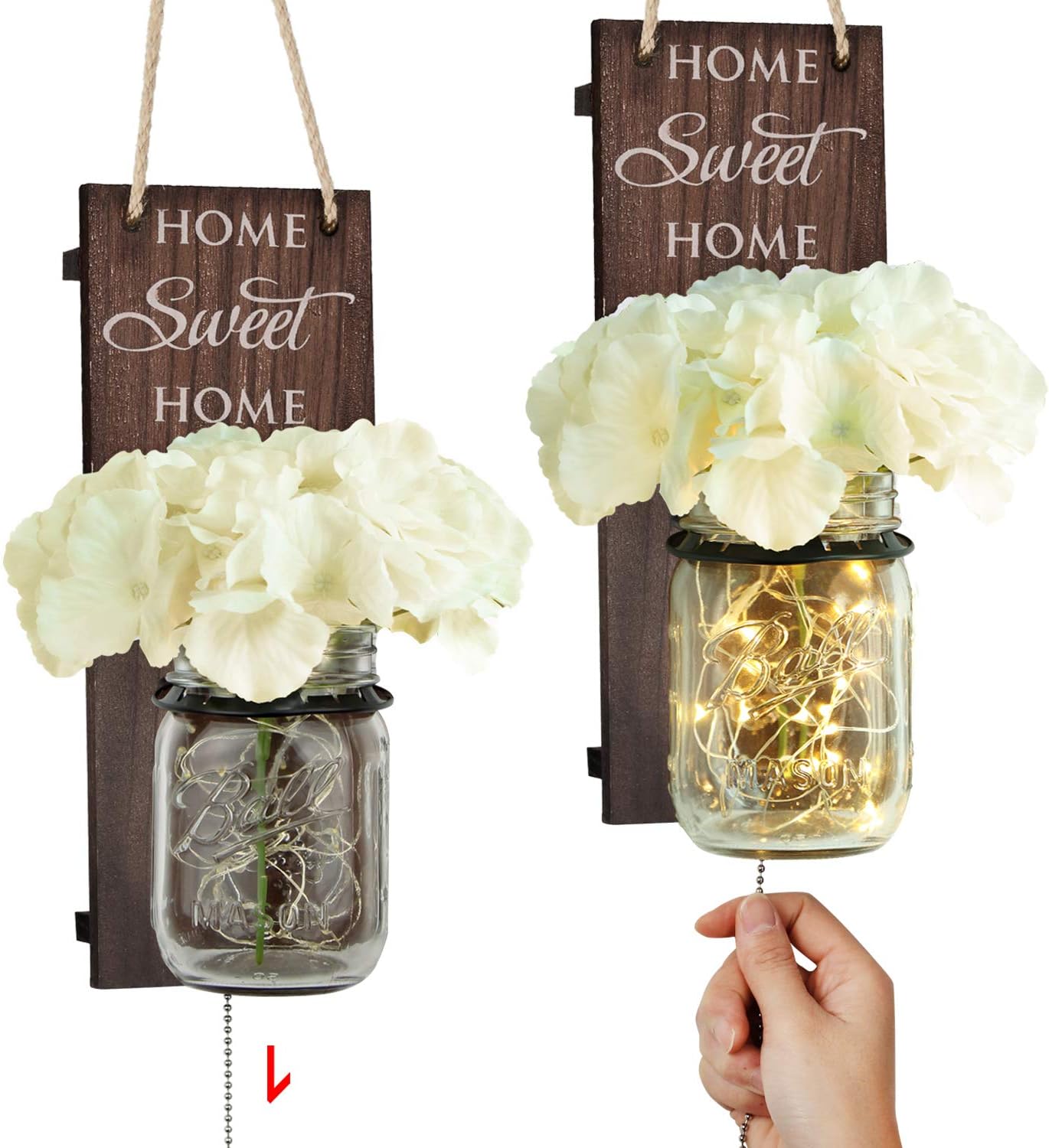 TJ.MOREE Rustic Wall Sconce - Mason Jar Wall Sconce, Rustic Home Decor with Pull Chain Switch, Silk Hydrangea and LED Strip Lights Design for Home Decoration Home Sweet Home Housewarming Gift Set of 2