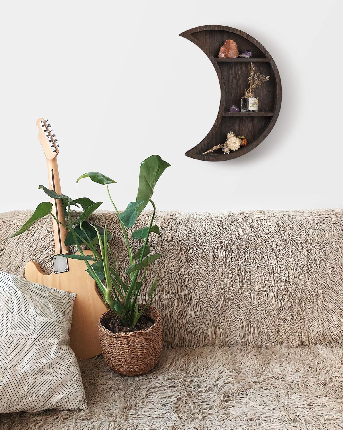 - This moon sign hanging floating shelf is the perfect storage and decorate shelf for many rooms in the home. They provide a touch of warmness and rusticness to any space applied, the perfect piece for any rustic, minimal, or natural home decor.